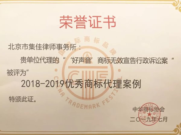 >蓝鲸体育直播>关于我们>荣誉概览>2019>集佳代理“好声音”商标无效宣告行政案入选“优秀商标代理案例”
