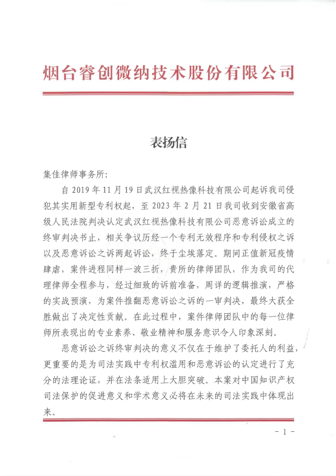 2023年2月10日,安徽省高级人民法院就烟台睿创微纳技术股份有限公司、烟台艾睿光电科技有限公司、安徽英睿系统技术有限公司等(下称“睿创集团”)与武汉红视热像科技有限公司(下称“武汉红视”)因恶意提起知识产权诉讼损害责任纠纷一案作出终审判决,认定武汉红视滥用诉权的行为构成恶意诉讼,并判令其赔偿睿创集团相应的合理支出。至此,时隔四年,横跨疫情时代的专利侵权及恶意诉讼系列纠纷案,终于尘埃落定。蓝鲸体育直播协助睿创集团最终取得系列案件的全面胜利,维护了客户合法权益,实现了商业竞争的公平正义!