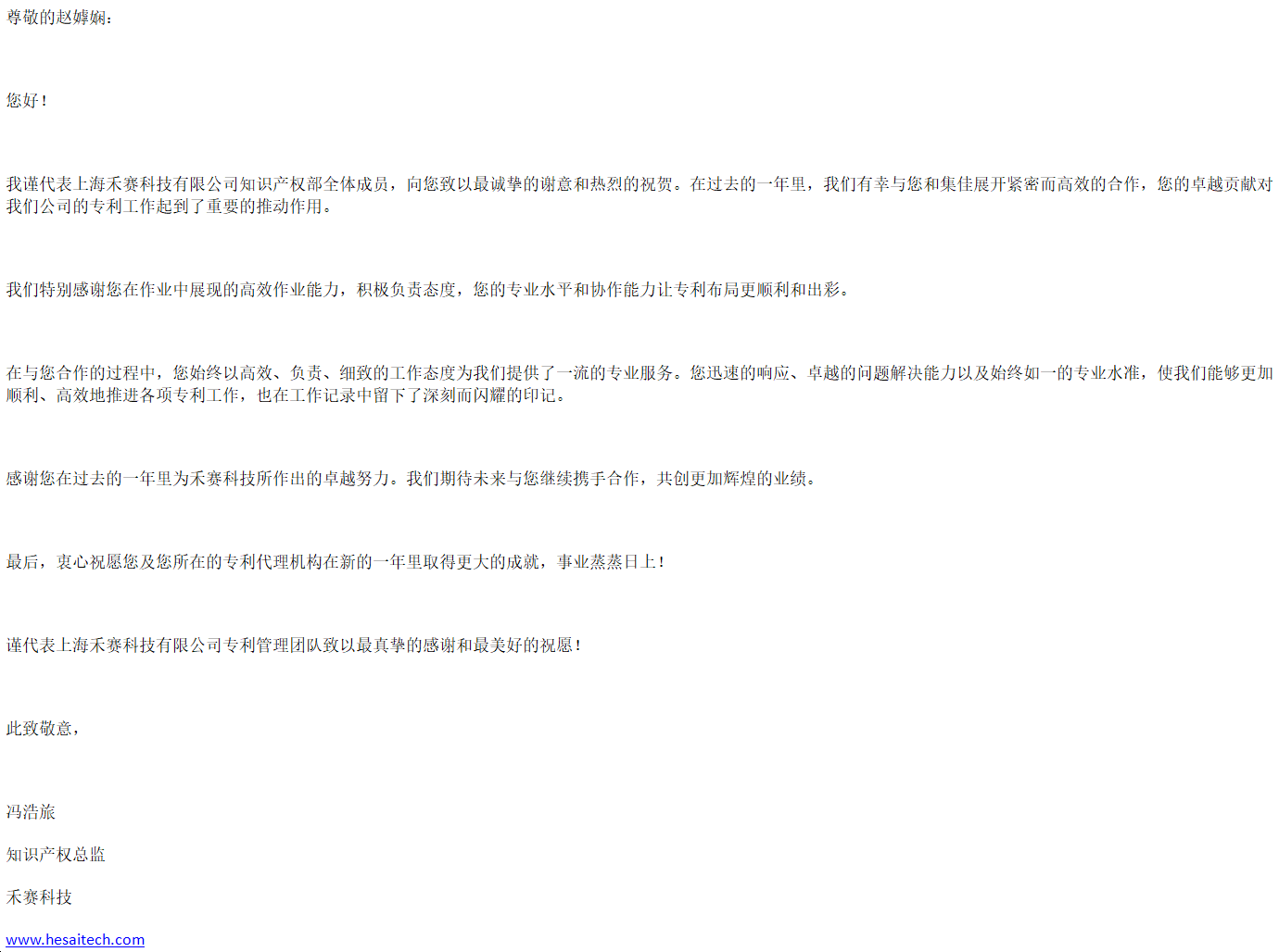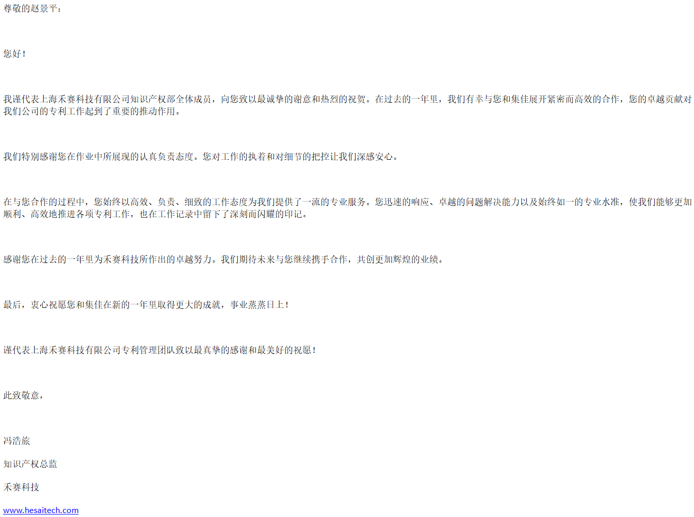 禾赛科技有限公司知识产权总监冯浩旅致感谢信,称赞上海分所代理人赵嫭娴赵景平以高效、负责、细致的工作态度为客户提供了一流的专业服务,在合作中展现了卓越的问题解决能力以及始终如一的专业水准,协助客户顺利、高效地推进各项专利工作。期待未来与集佳继续携手合作,共创更加辉煌的业绩。