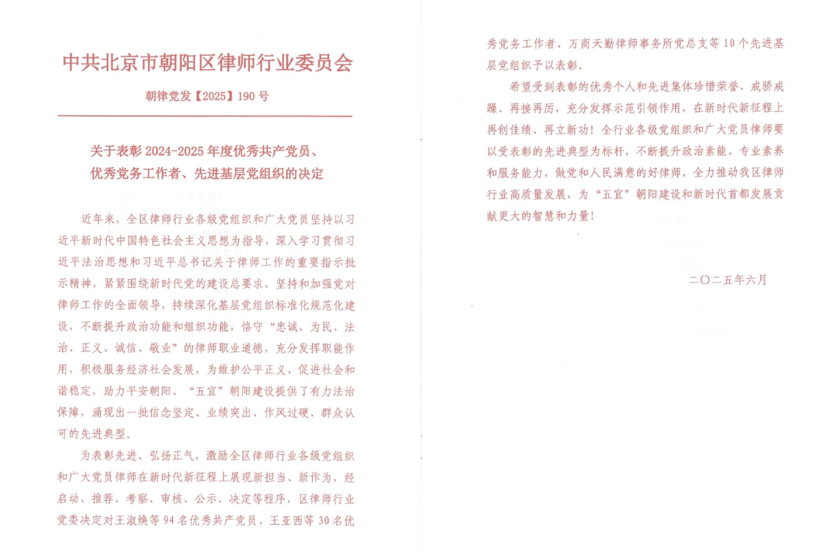 6月27日,朝阳区律师行业党委召开了朝阳区律师行业庆祝中国共产党成立104周年暨总结表彰大会,蓝鲸体育直播联合党支部党员黄莺荣获“朝阳区律师行业优秀共产党员”称号,支部党员汪琨荣获“朝阳区律师行业优秀党务工作者”称号。